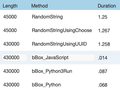Like the Python versions, this implementation was essentially equivalent in performance to the fastest native solution, but for larger amounts of data it is almost 3x faster than even the Python methods. The last line of the JavaScript might have you puzzled. The fm.evaluate function is a way to get a value from FileMaker into JavaScript, and the FileMaker global $count will have been set to the the desired string length before this is called.